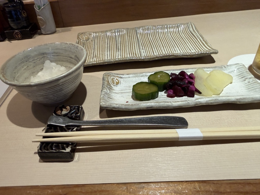 お通しは漬物たち。しっかり漬かっていてうまい。特にきゅうりうまいな。