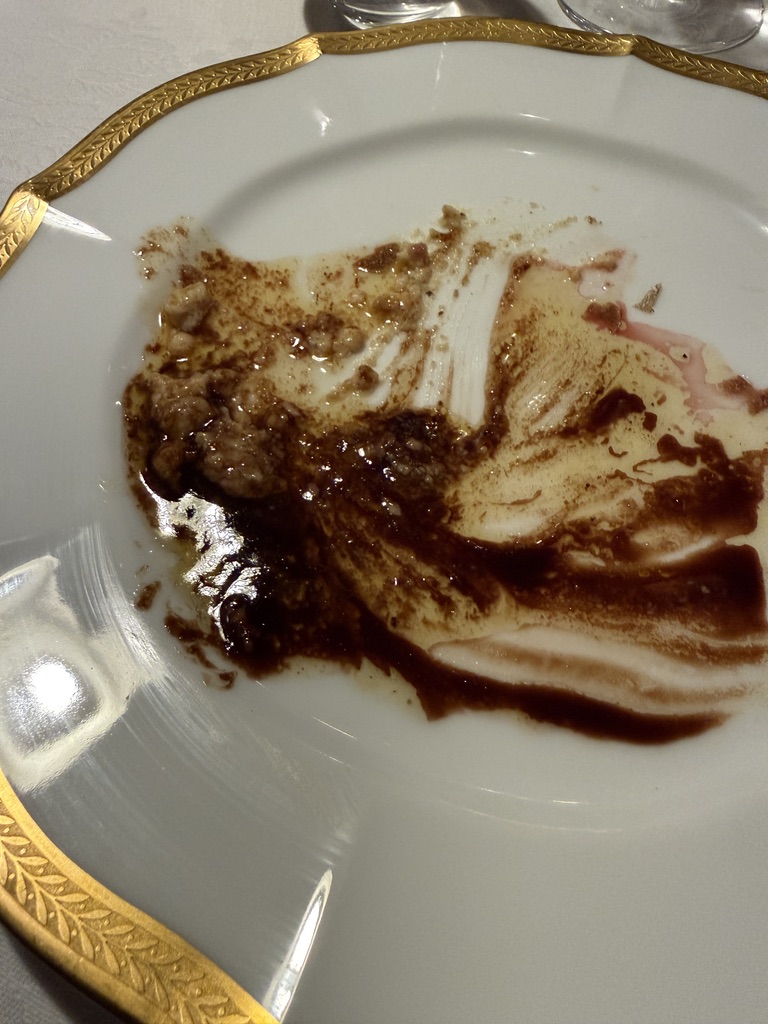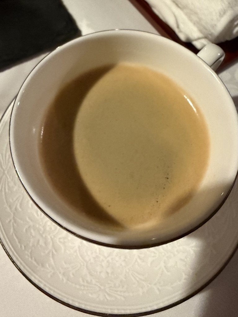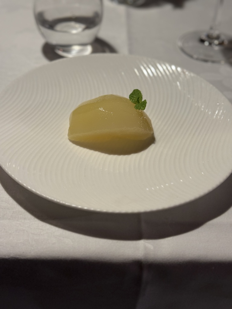 デザートはケーキとか5種類くらいから選べて、というか全部注文できるらしい。流石に腹パンだったので、洋梨のコンポートをお願いしました。甘味と酸味でさっぱり。