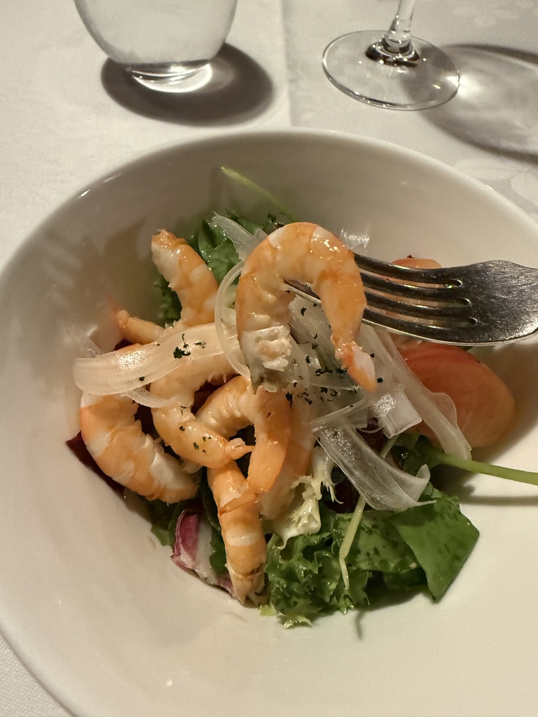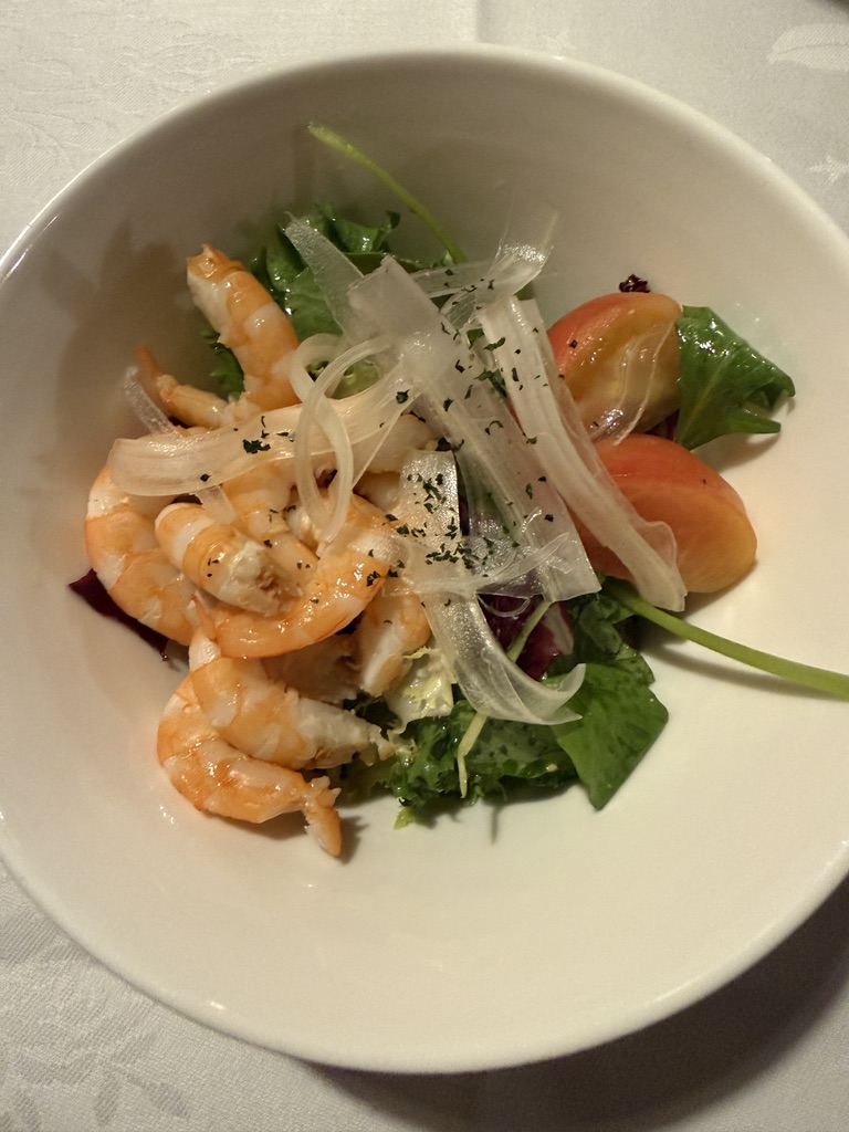 お次はサラダ。明石でとれた海老を使ったサラダ。