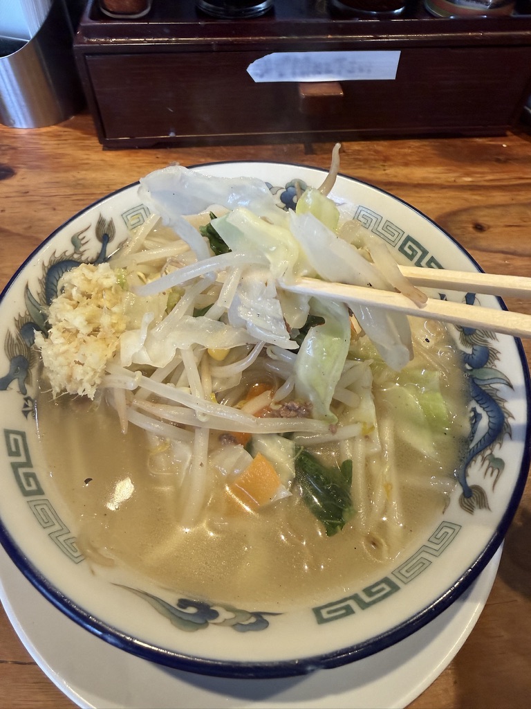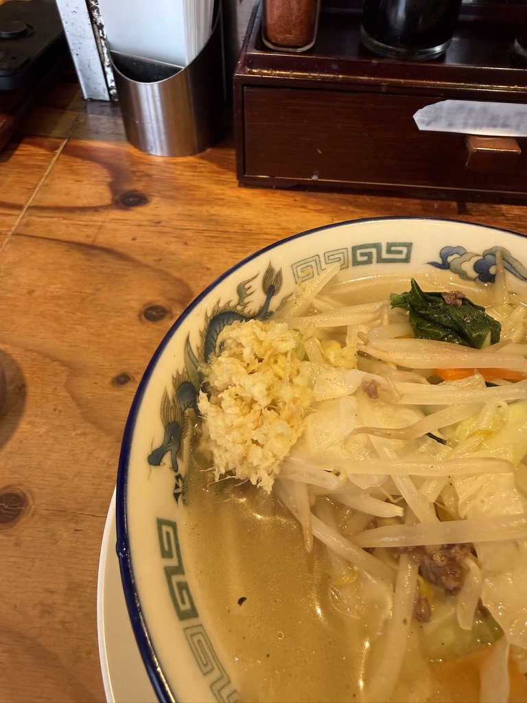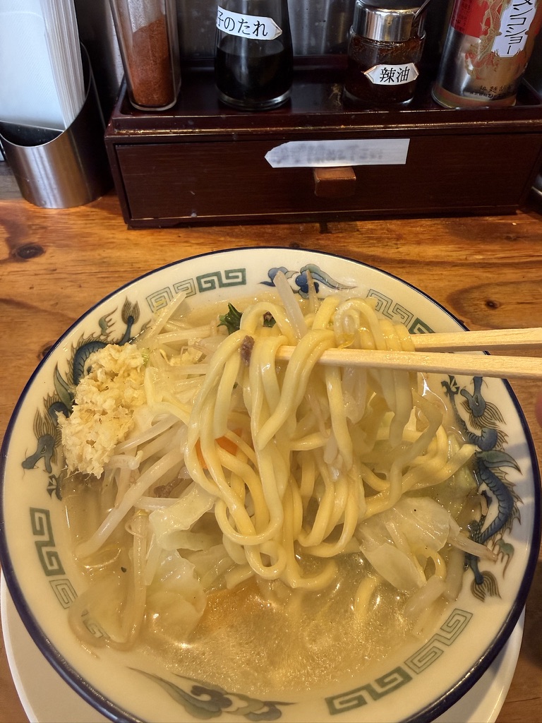 ハーフとは言え、野菜は200gなのでたっぷり。生姜がガッツリ乗ってるのが姫路タンメンの特徴な模様。(ちなみに乗せるかどうかは注文の際に聞かれました)