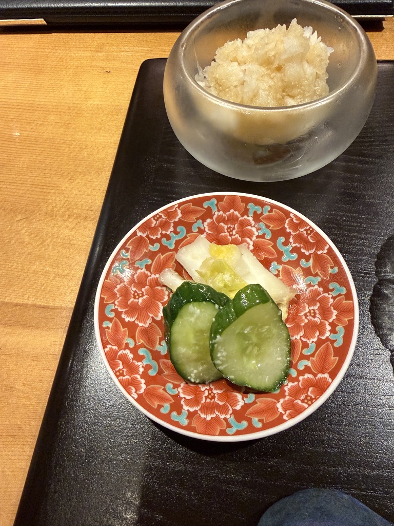 箸休めの大根おろしときゅうりと白菜の漬物。