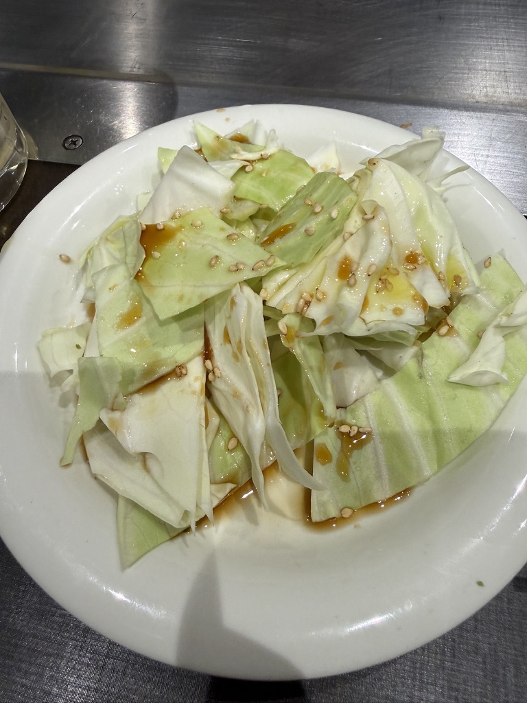 焼き物を頼むとついてくるキャベツ。つまんでいきます。