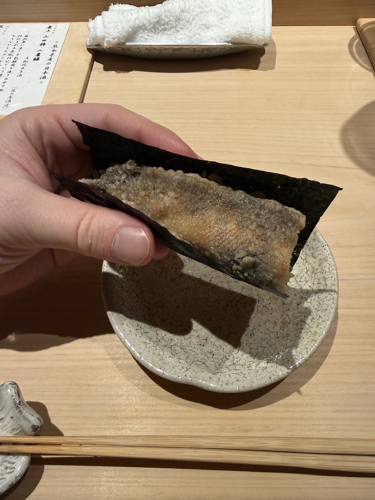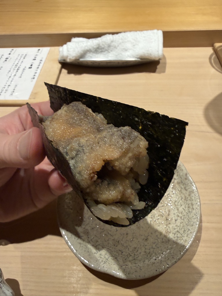 初手はメヒカリを揚げたものを手巻きで。揚げ物は初めてかも。サクッとジューシーでうまし。