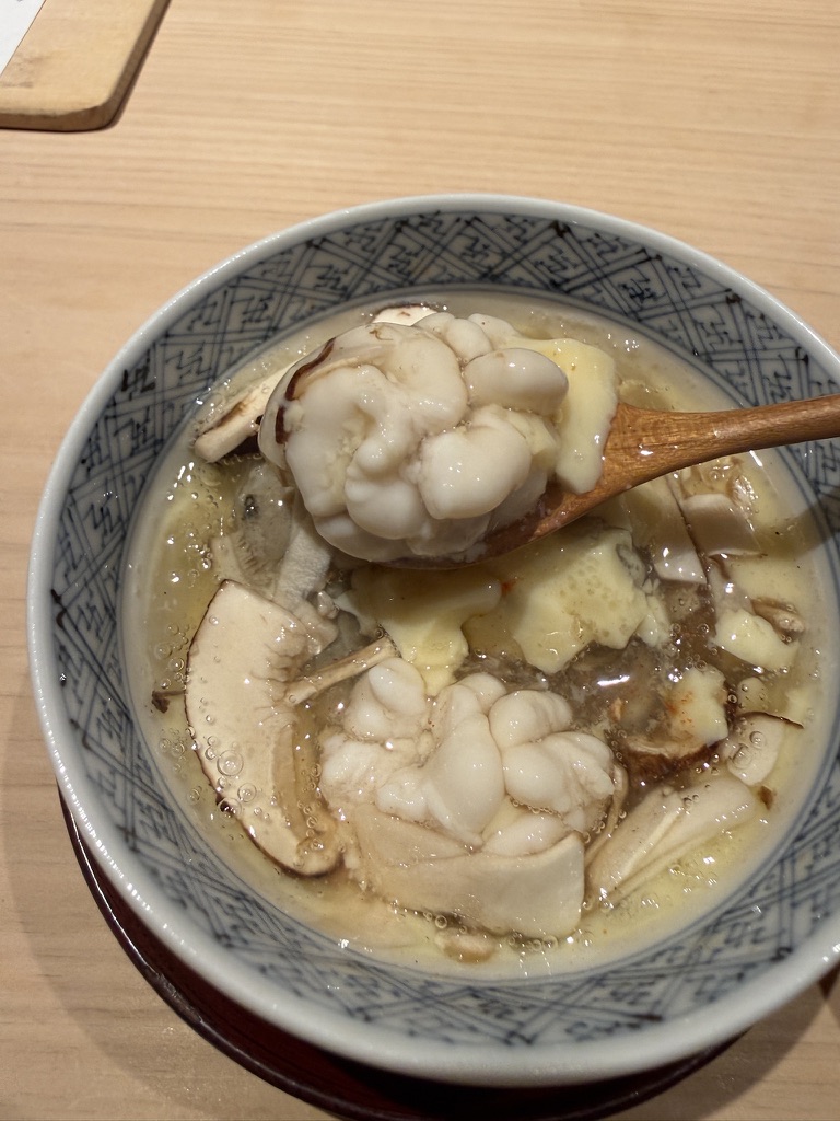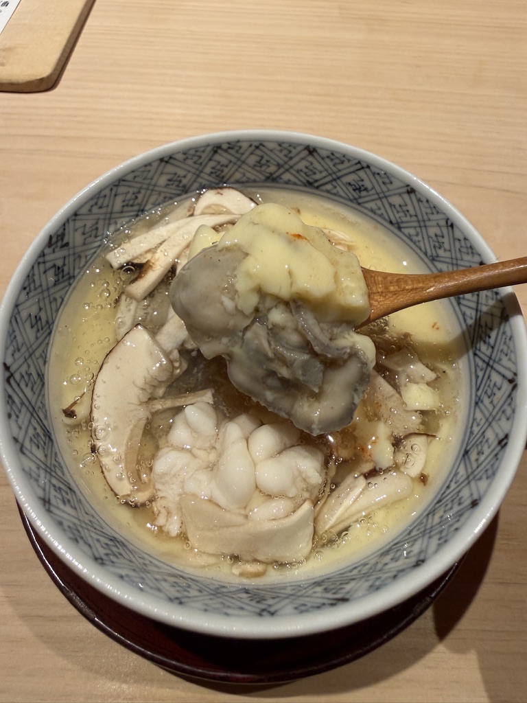 松茸がふんだんに散らされていて、豪華絢爛。それを掘っていくと白子が2、牡蠣が1、海老が1という贅沢さ。海老だけ単体撮り忘れてしまったけど。