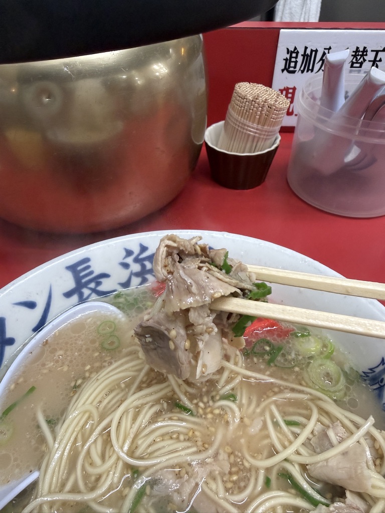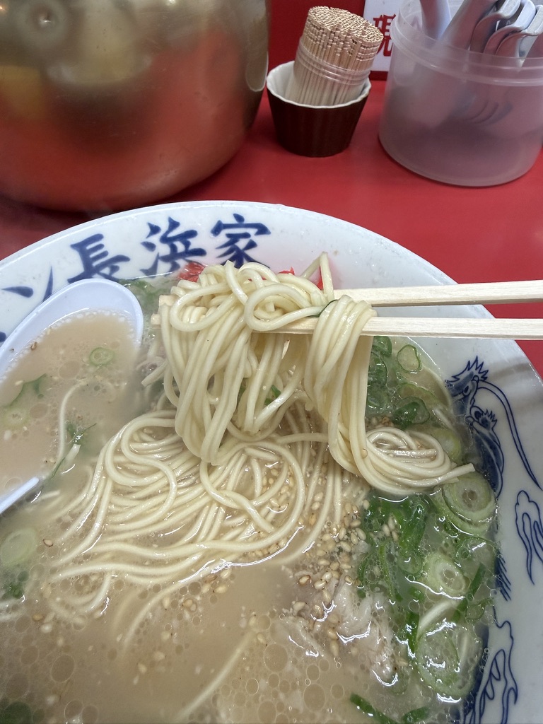 元祖長浜屋の方は、ファーストインパクトがスープ薄めな感じだったけど、こちらはしっかり。