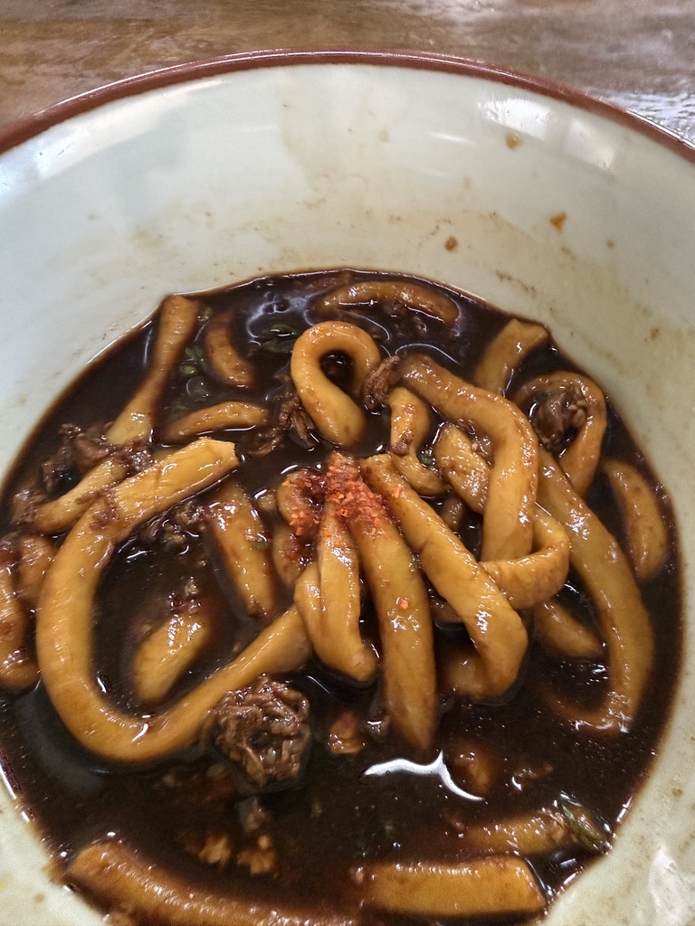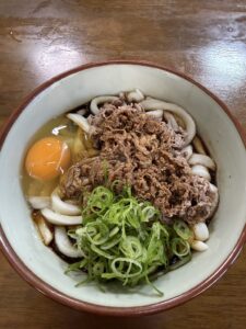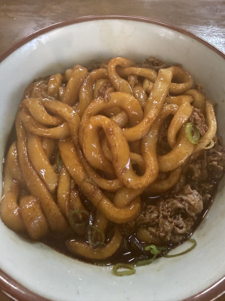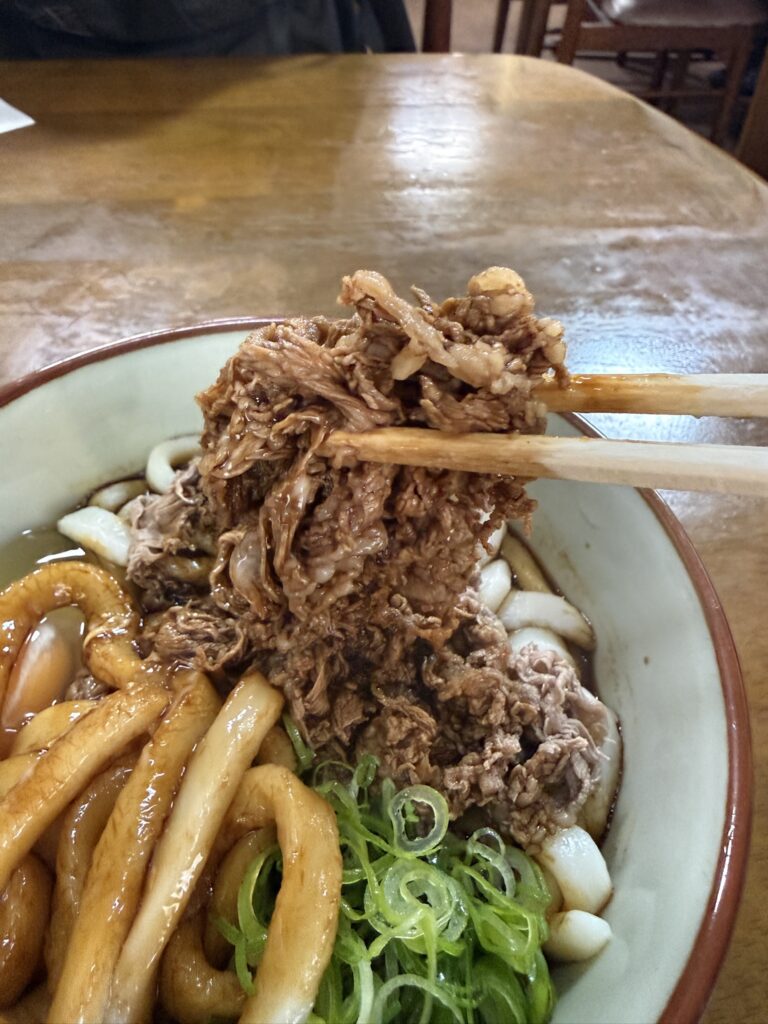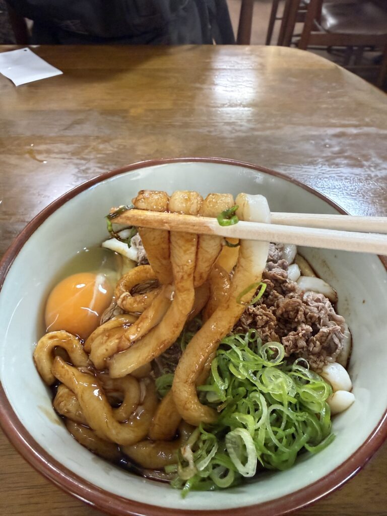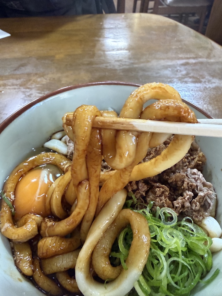 肉と卵とタレが混ざったからなのか、めちゃくちゃすき焼き感が出て、すき焼きの〆のうどんに近いものに。