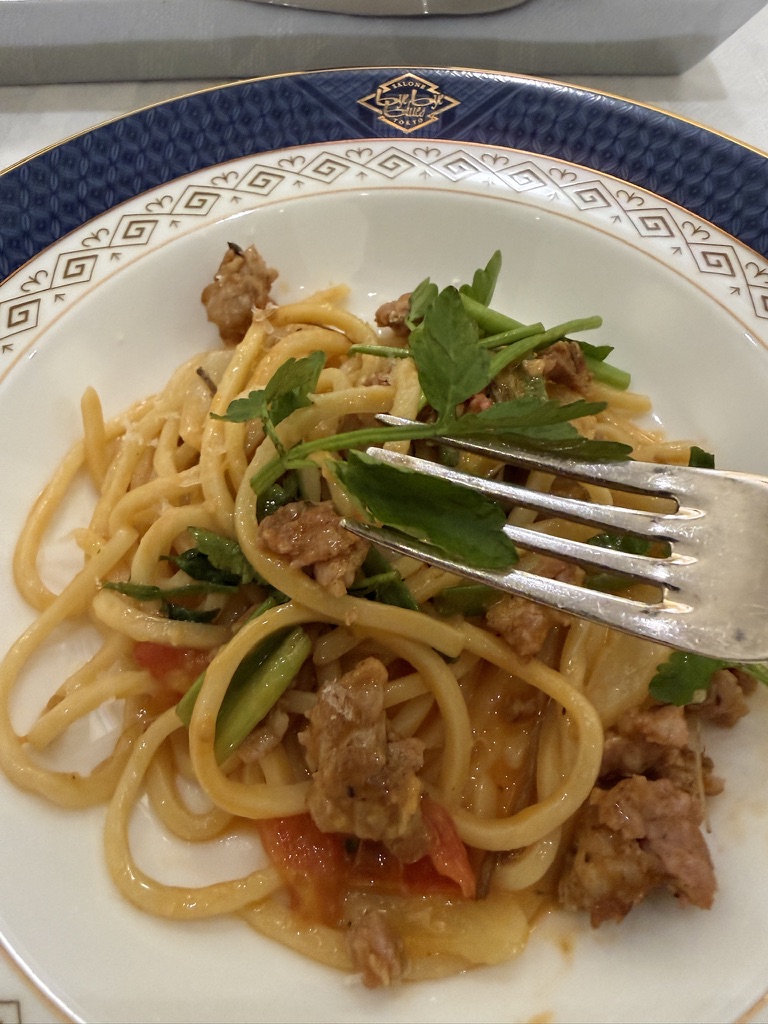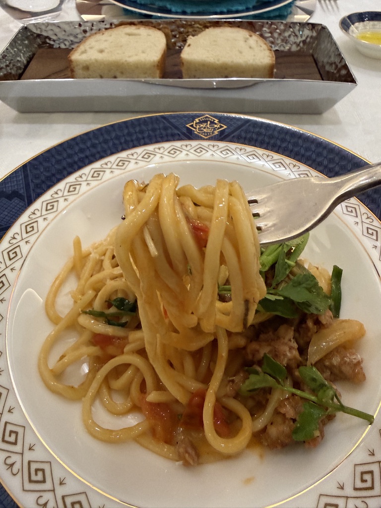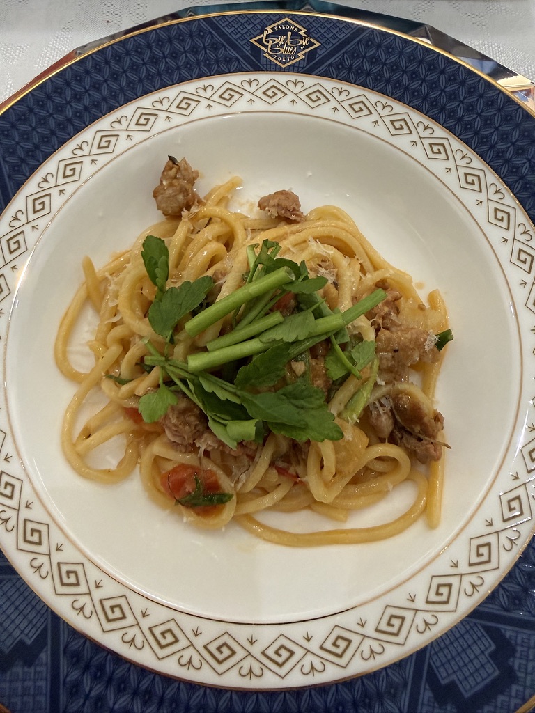 もっちり食感ながらまんまラーメン的な感じで面白い。サルシッチャの肉とラグザーノチーズのパンチとドライトマトの旨味、セリ、ウイキョウの香りが合わさってうまし。