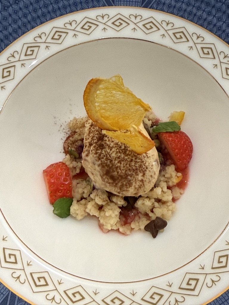そこに苺、チョコレートの甘味が加わり、オレンジチップス、スペアミントで爽やかさが包み込む。