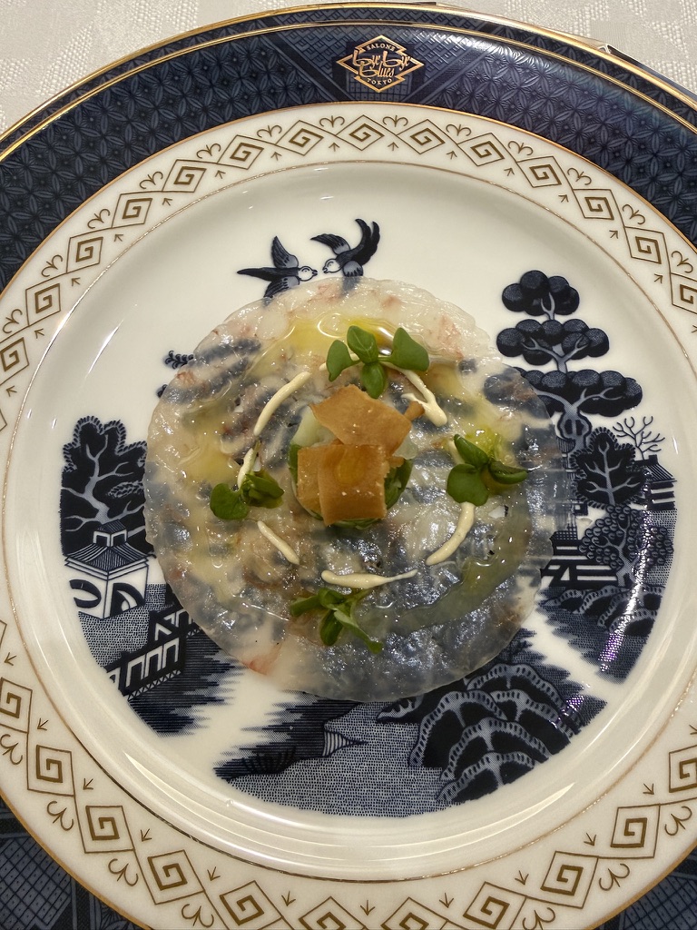 メークインのサラダに鮪のカラスミ、マイクロバジルにレモンオイルをかけたもの。さらにメークインのサラダ(インゲン、アオリイカ)が乗っかり混ぜて頂きます。