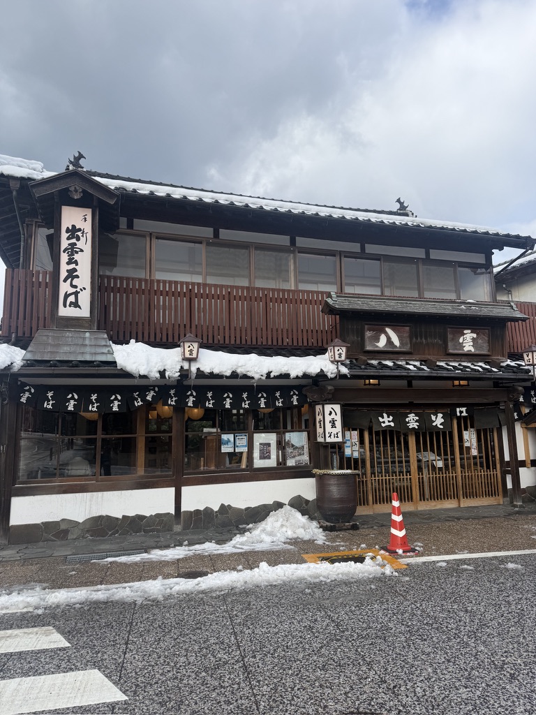 駅からトボトボ歩いて、出雲大社の入口まで行くも先に朝ごはんをと思い、左折。雪が溶けておらずめちゃくちゃ歩きづらい中、10分ほど歩いてきたのがこちら。
