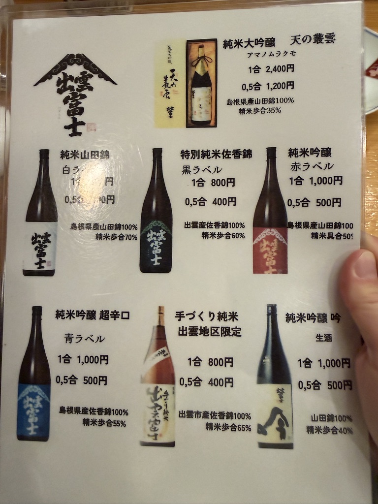 おまかせのコースでお願いをしました。こちらも日本酒豊富。すぐ近くに醸造所があるらしい出雲富士。頼んでみよう。