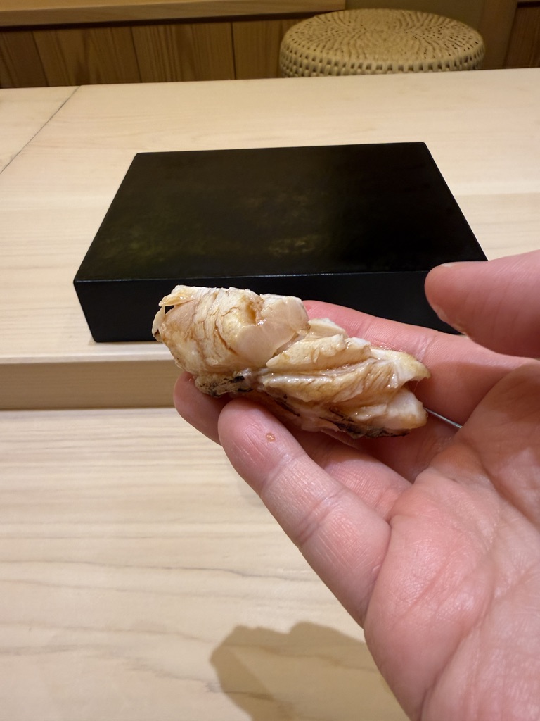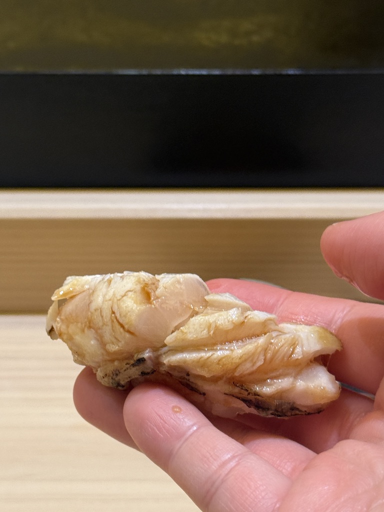 置くと崩れてしまうってことで、手渡しでいただきます。持ってより分かる脂たっぷり。軽く炙ってあり香りも最高。