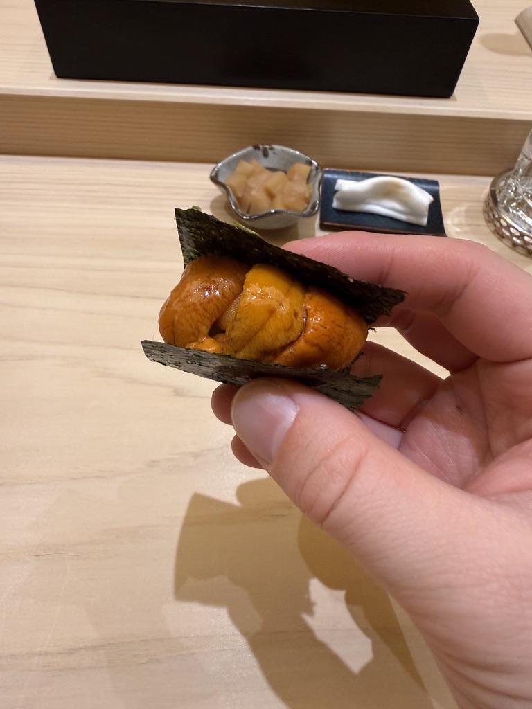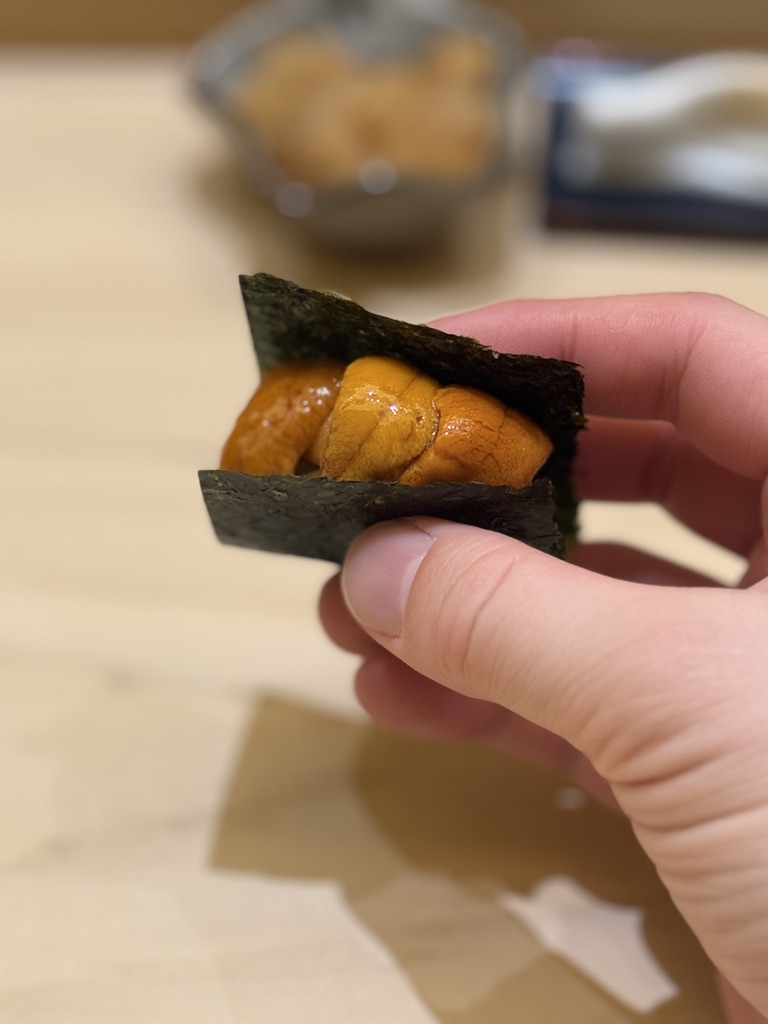 新潟では雲丹は取れないらしく、こちらのみ地のものではないもの。雲丹がうますぎることは言うまでもないんだけど、海苔が抜群に旨い。わさびもバッチリ効いていて、雲丹、海苔、シャリをまとめ上げている。