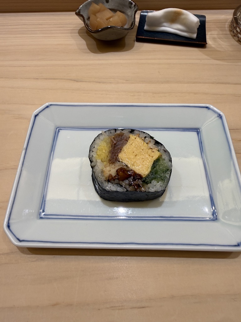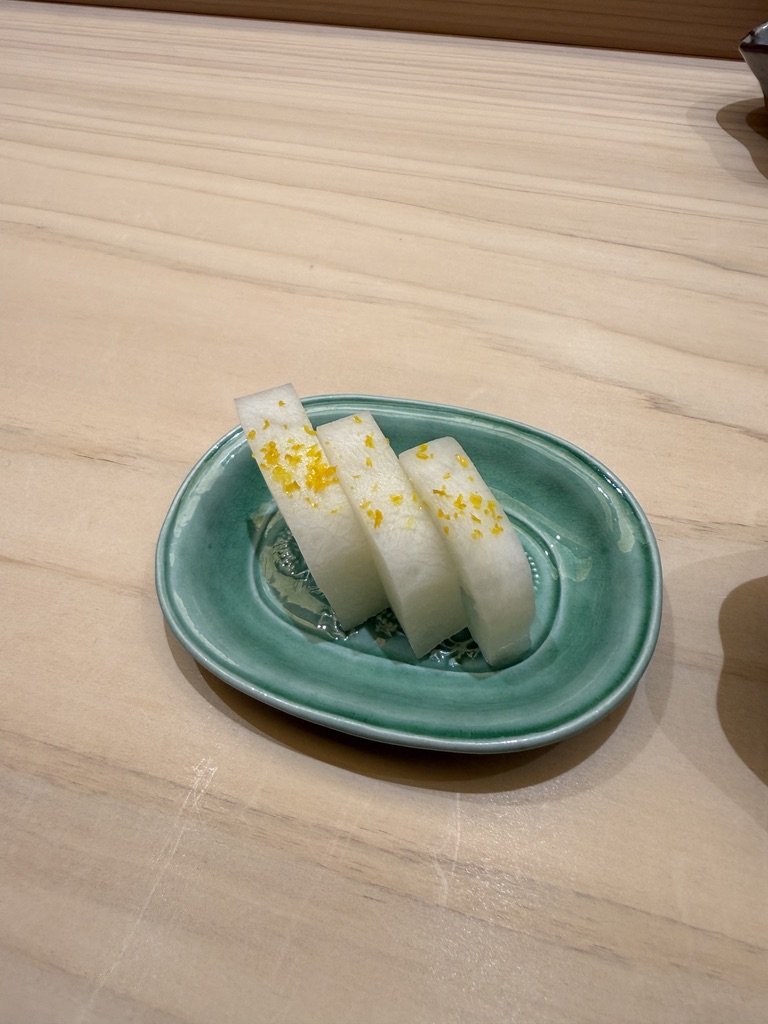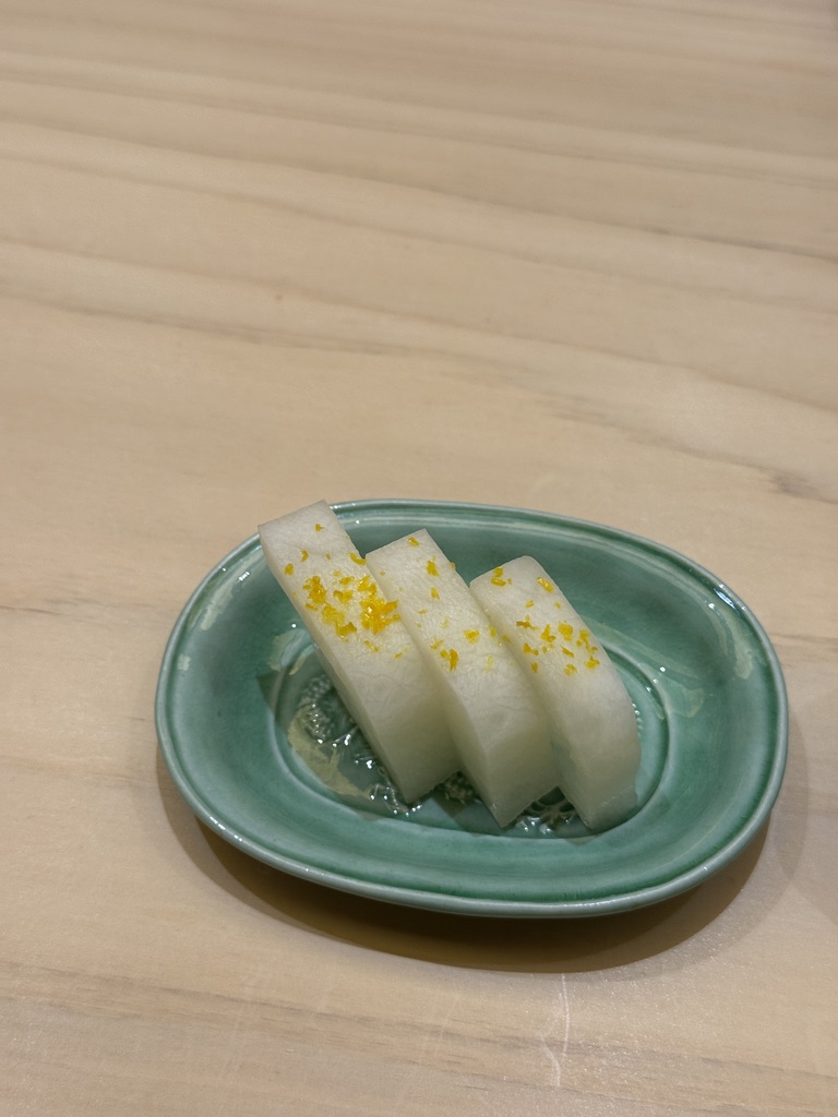 大トロの次はあん肝。ハードパンチで畳み掛けられる。ただ、きゅうりの奈良漬がいい仕事をしていて、爽やかさと旨味が加わるので、一生食べられる。