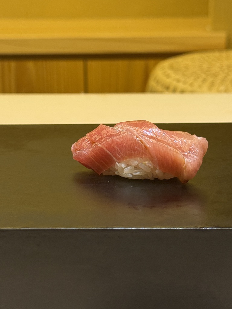 佐渡定置網大トロ140kgを水揚げ2週間寝かせたもの。ねっとりと絡みつく上質な脂がたまらん。そこにシャリが加わり、全くくどくなく頂ける。