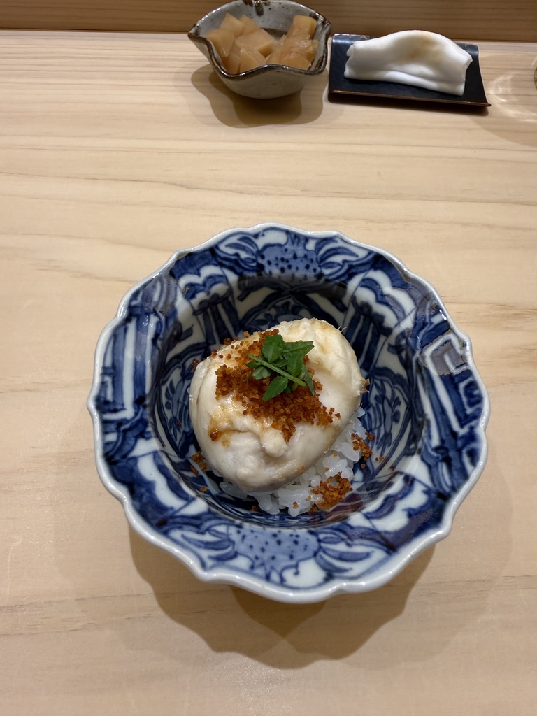 フグの白子の表面を焼いて下にシャリを敷いて混ぜて頂く。何よりも、この上にかかったふりかけ状のものが、聞いてビックリ、フグの卵巣。当然、毒があるので普通は食べられないけど、3年かけて毒抜きをしたとのこと。そんな事が可能だったとは。世界は広い。