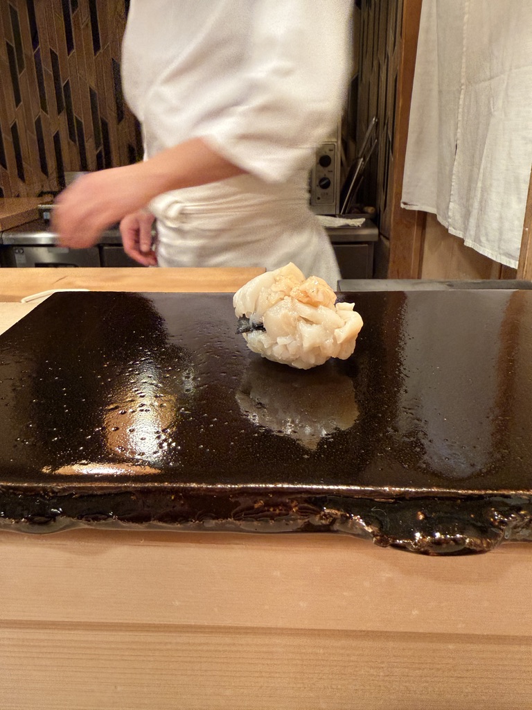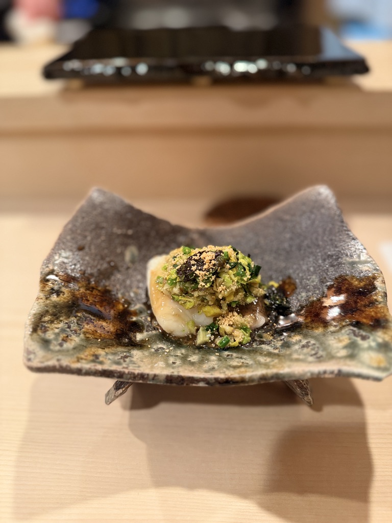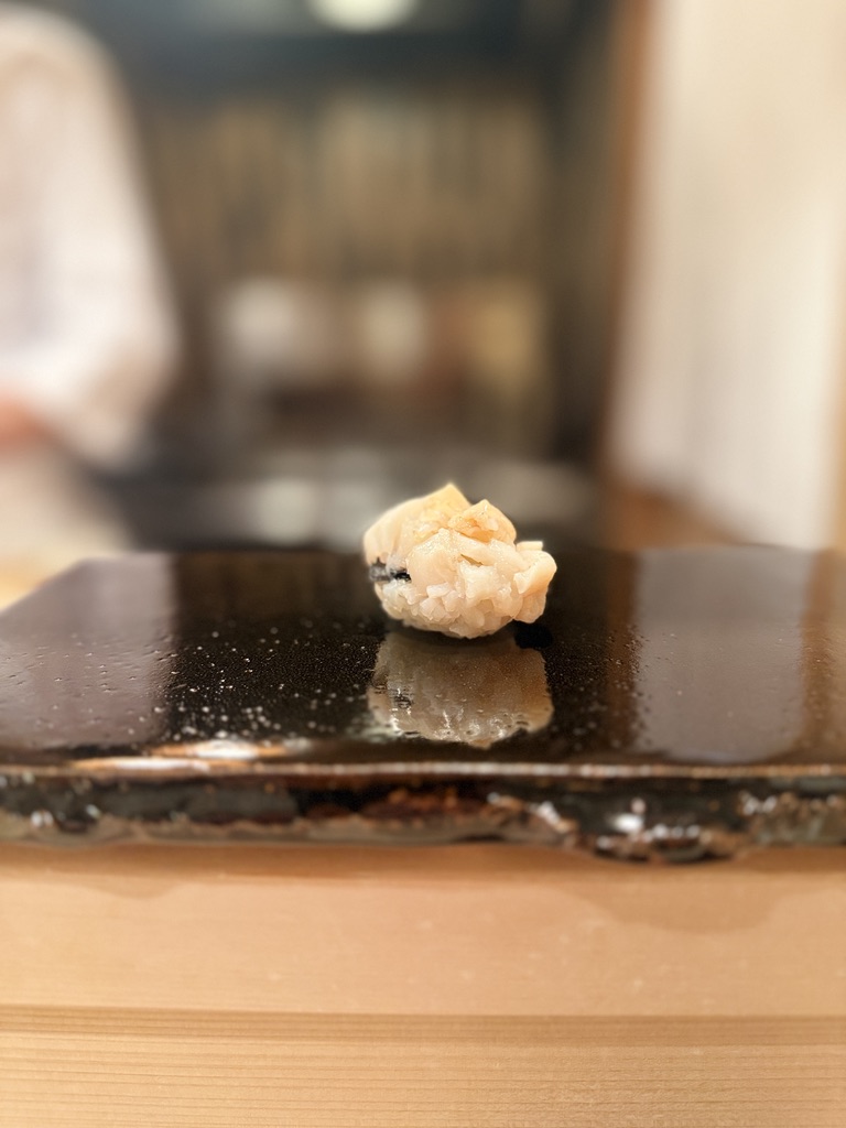 バイ貝はシャリとの間に梅のペーストと海苔を挟んである。先程のあわびは蒸してあるのでしっとり、こちらは貝ならではの食感を楽しめる。それぞれの貝の良さがわかるコンビネーション。