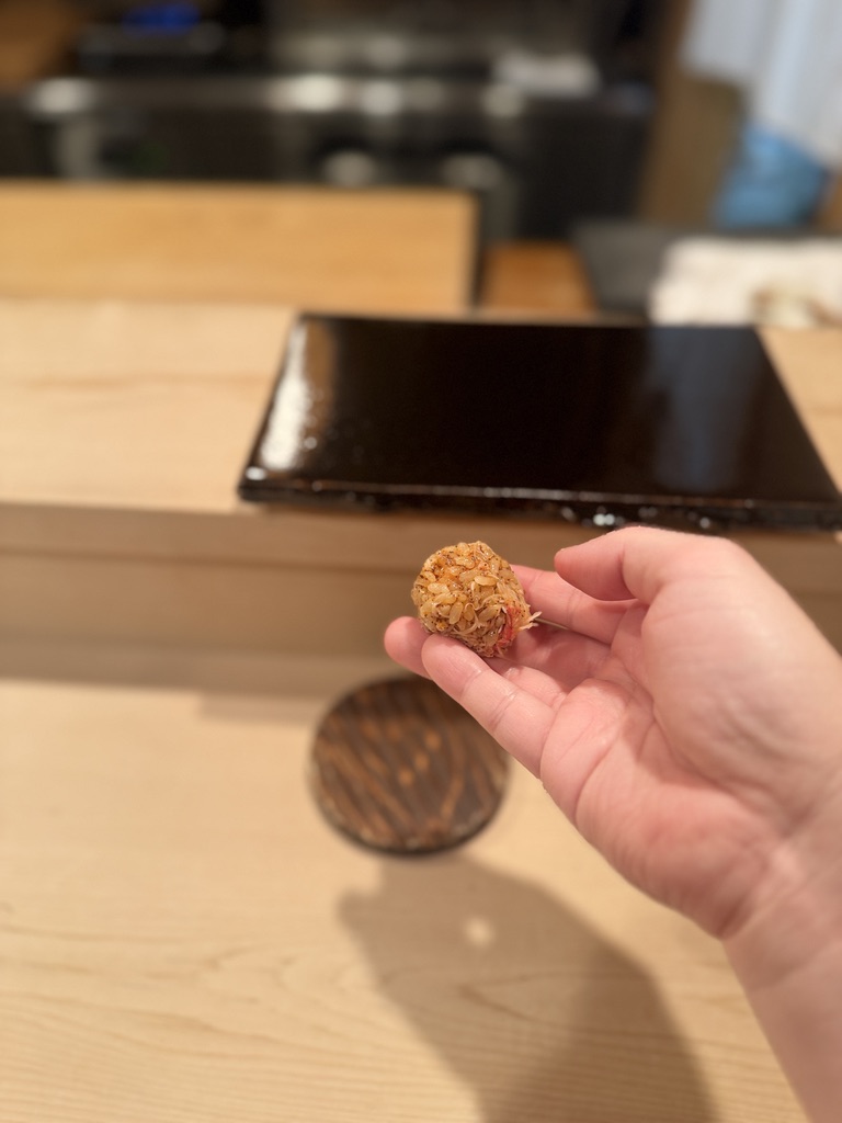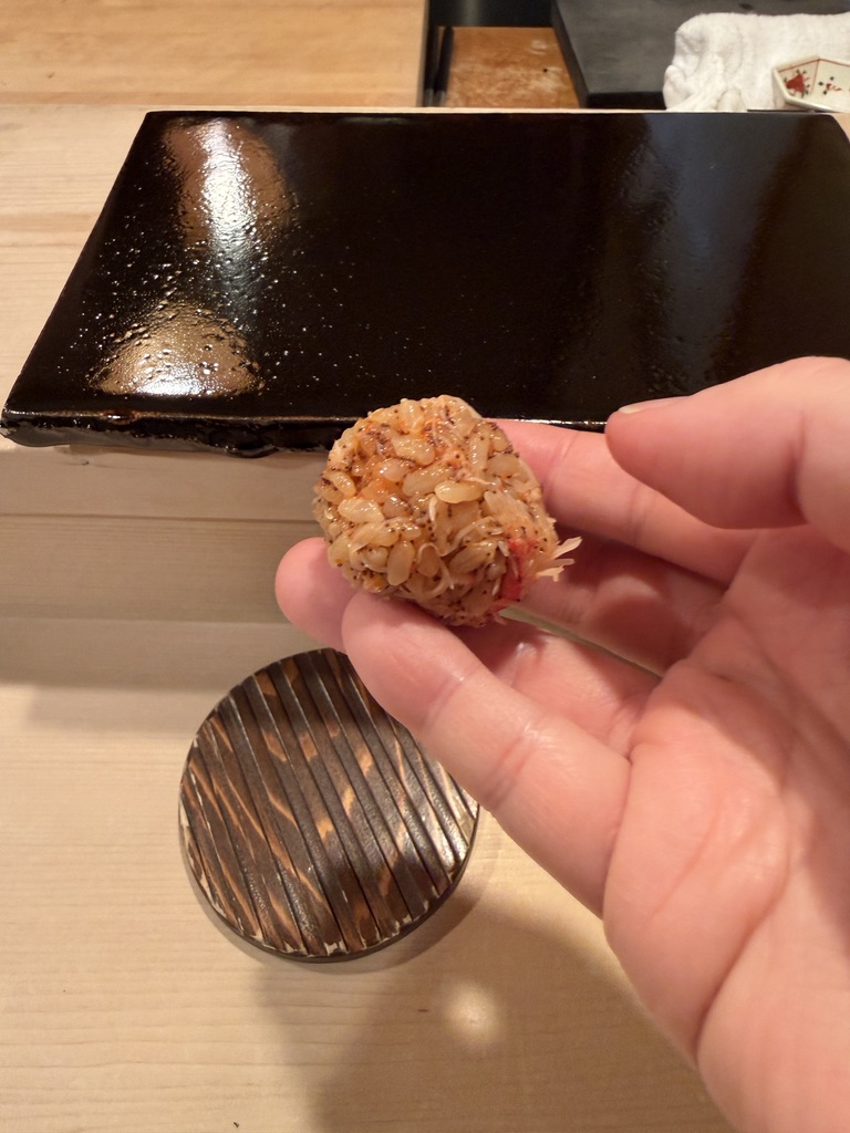 めがに(香箱蟹)。握りというかシャリに混ぜたものを握ってもらい手渡しで頂きました。