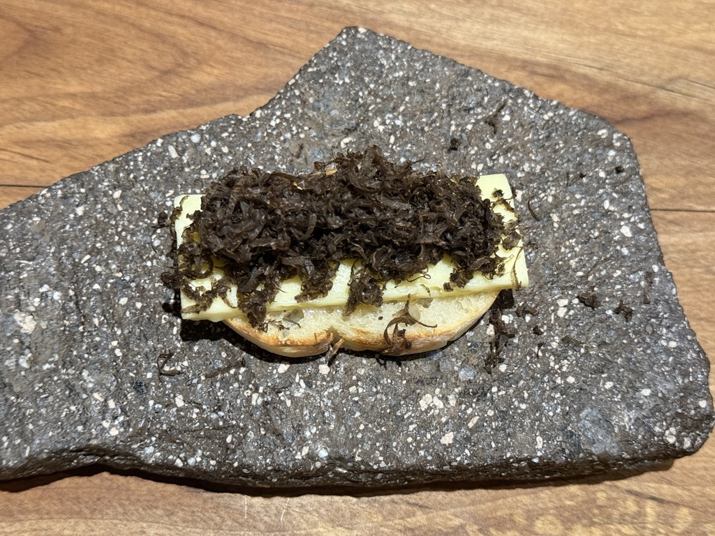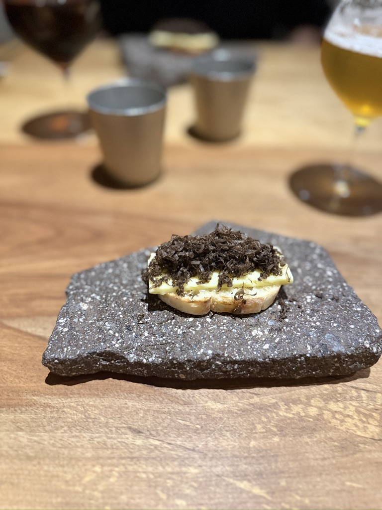 いきなりの黒トリュフ。その下には燻製されたバターと自家製のパン。