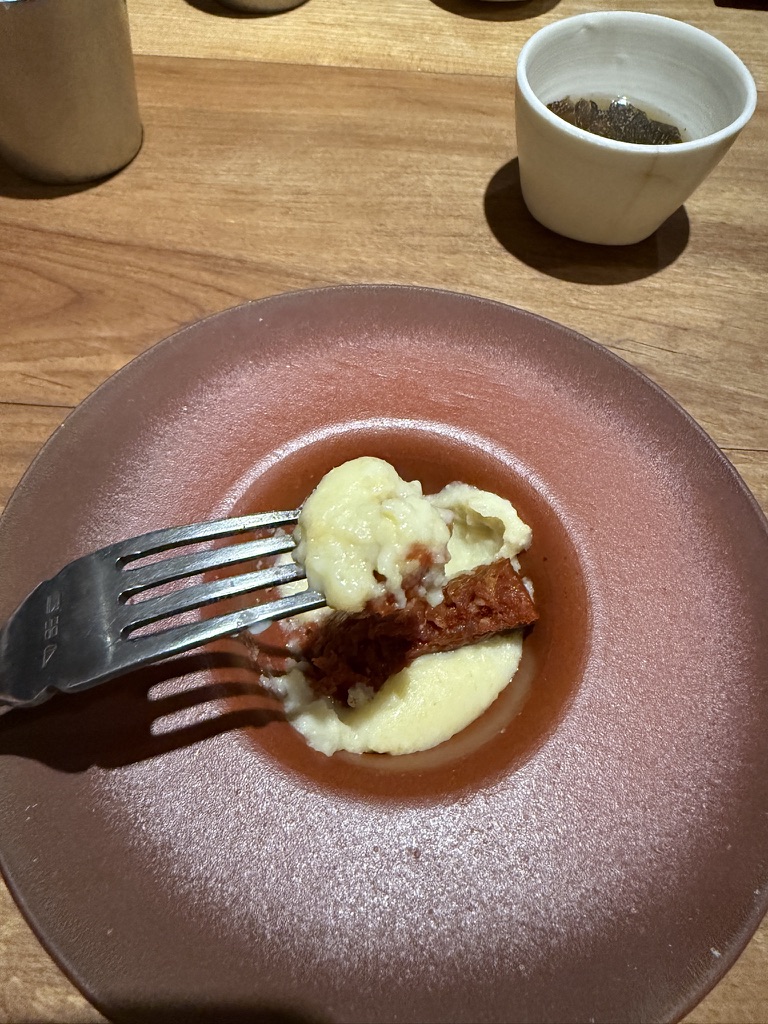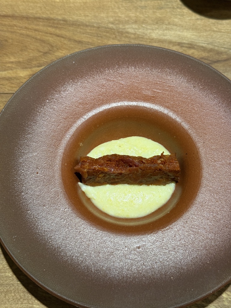 鴨のチョリソー。チョリソーと言いつつ、普段食べているソーセージ的なチョリソーというよりは、ミンチのようなスタイル。それをポレンタの上に鎮座。当然ポレンタも未食。一瞬マッシュポテトかと思いきや、そうではなくとうもろこし粉を使ったものらしい。