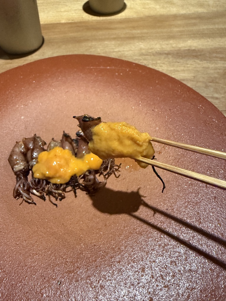 雲丹といっしょに。この組み合わせは初めて食べましたが、それぞれ異なる甘味が合わさって当然のごとくうまい。