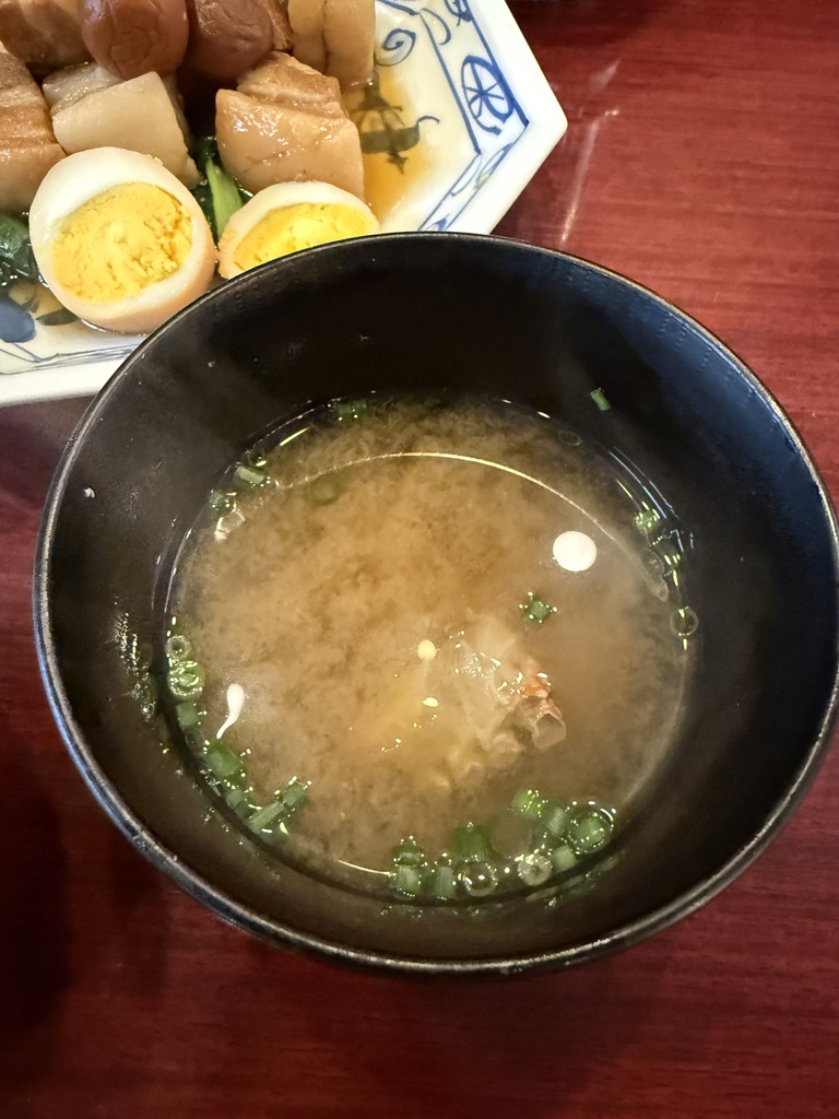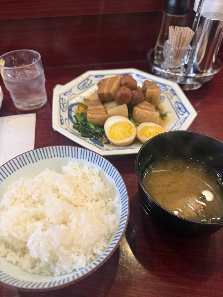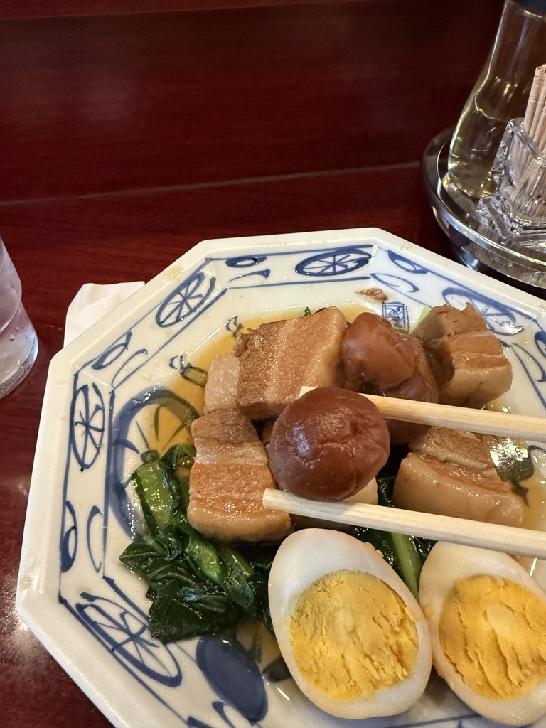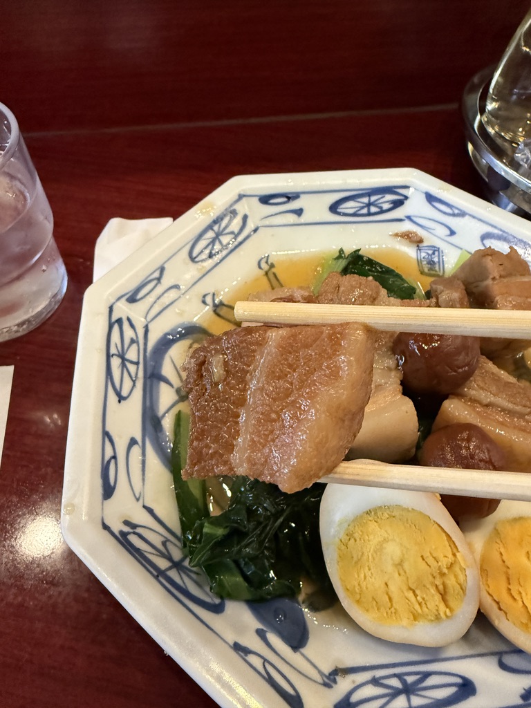 豚バラ、ぶ厚め。脂と赤身の層がしっかりあって、噛むとじゅわっとくる。ちゃんと煮込まれていて柔らかいし、食べごたえもある。脂の旨味を堪能できるのがこの料理の醍醐味。