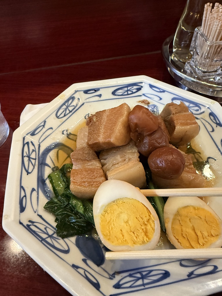 八角形の染付皿に、豚バラブロック・梅干し・ゆで卵(半割)・青梗菜がざっくり盛られてくる。なんともいえない家庭料理感。ふーみんの定番っすね。