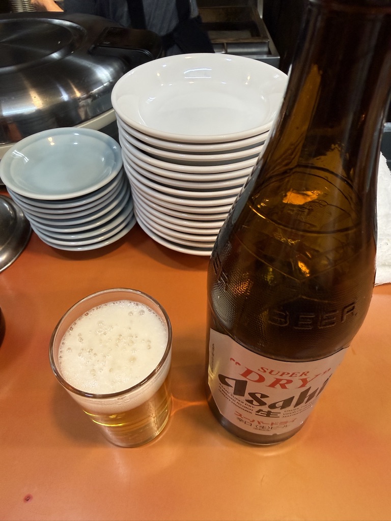 まず瓶ビールで。アサヒスーパードライ、中瓶。コップに注いでひと口。うまし。