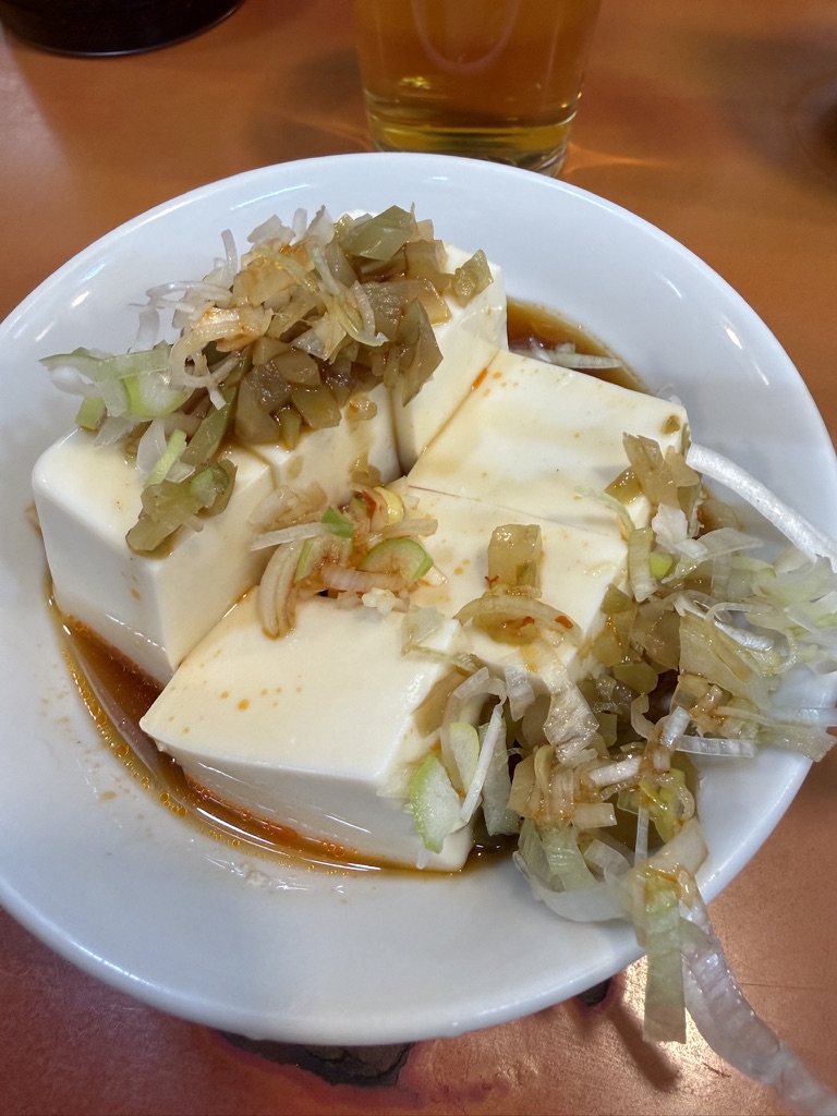 ザーサイ豆腐を注文。冷奴にザーサイと白ネギがたっぷり、ラー油入り?のタレでいただきます。。これがビールに合う。つまみとして普通に優秀。