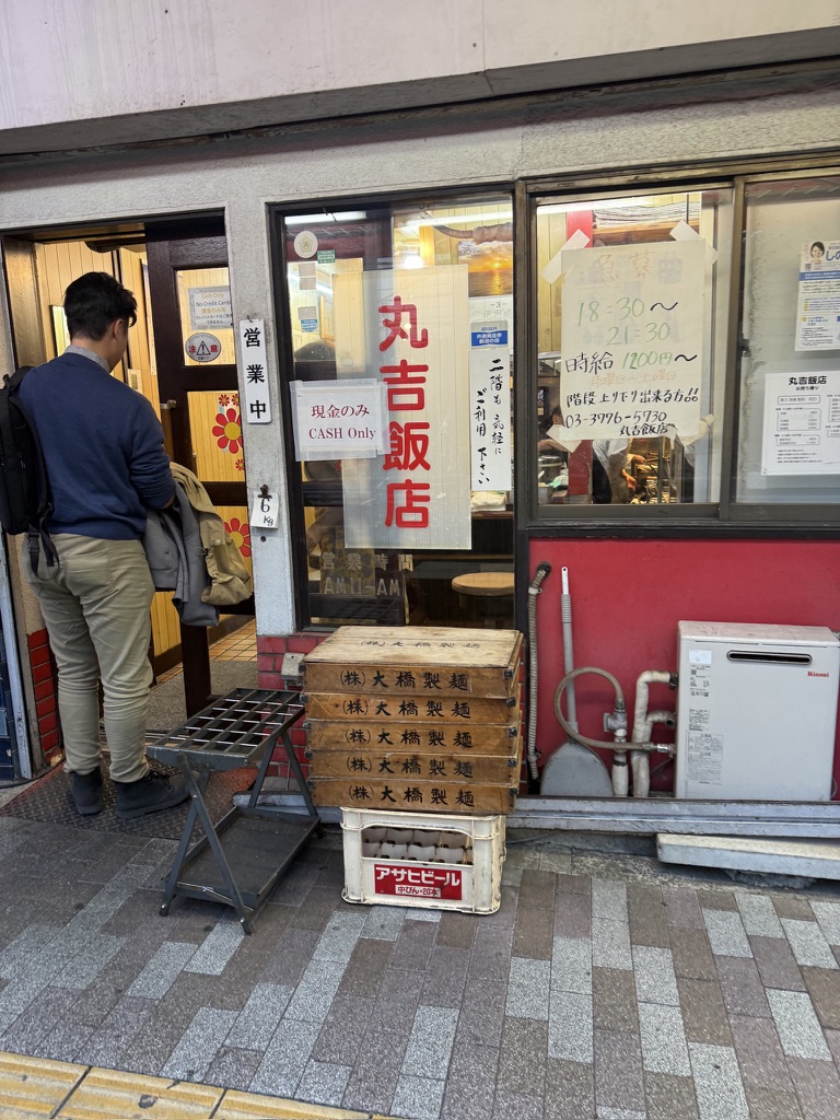 入口に「現金のみ」の張り紙。大橋製麺の麺箱が無造作に積まれた外観、いかにも昭和の街場の中華屋という感じ。