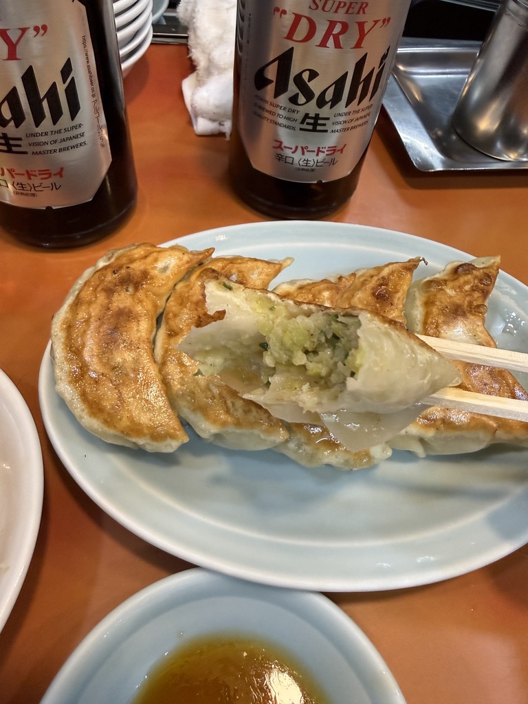 皮はパリッとしていて、中の餡はキャベツがしっかり感じられる気持ち甘めの仕上がり。ニンニクはそこまで強くなく食べやすい。肉汁じゅわっとまではいかないけど、これはこれでビールによく合う。