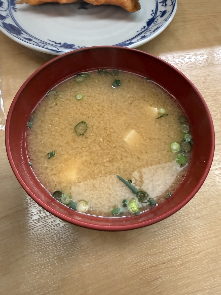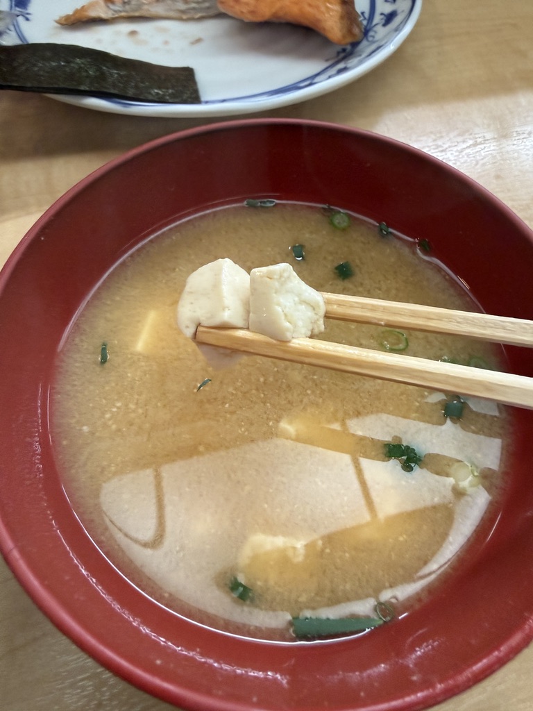 味噌汁は豆腐とネギ。気持ち濃いめで、しょっぱめの仕上がり。出汁よりも味噌前面な感じ。しゃけの塩分が控えめだったので、相互関係。
