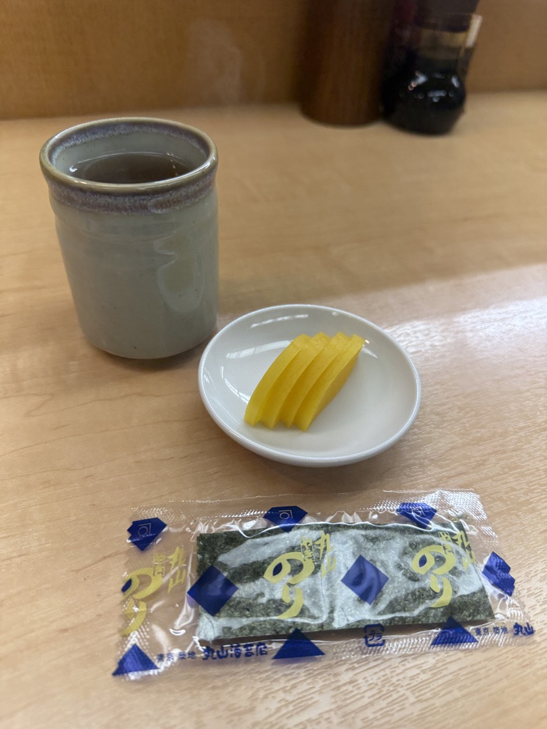 まずは、お茶とたくあんと海苔が到着。