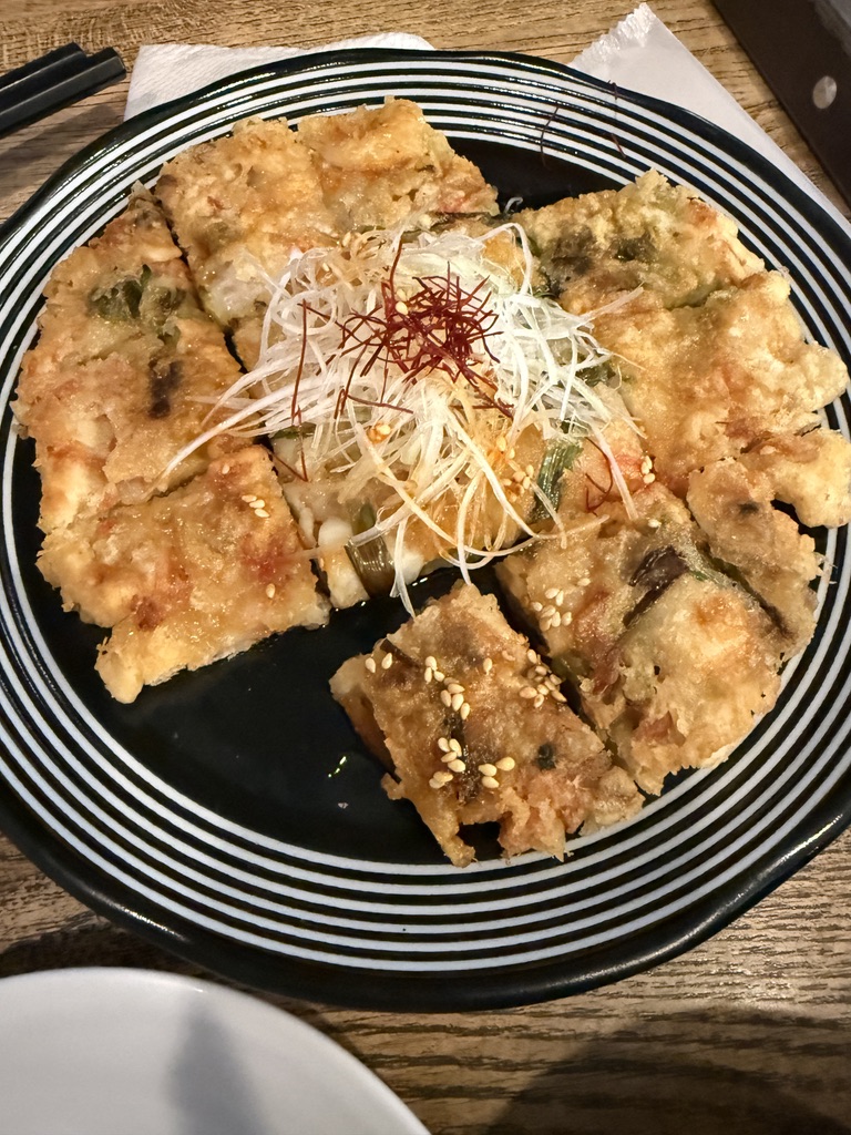 おつまみその2はシーフードチヂミ。表面カリッと、中もっちり。ツレとひとつずつつまんでから写真を撮ったので、皿の上がちょっと減ってる。昼食べずに観戦してたのも相まってビールとともにこちらもススム。