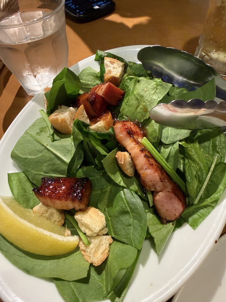 割とお腹はいっぱいってこともあり、野菜中心生活。ほうれん草サラダ。焼いたベーコンとクルトン入り。ボリューム感があって食べ応えあり。