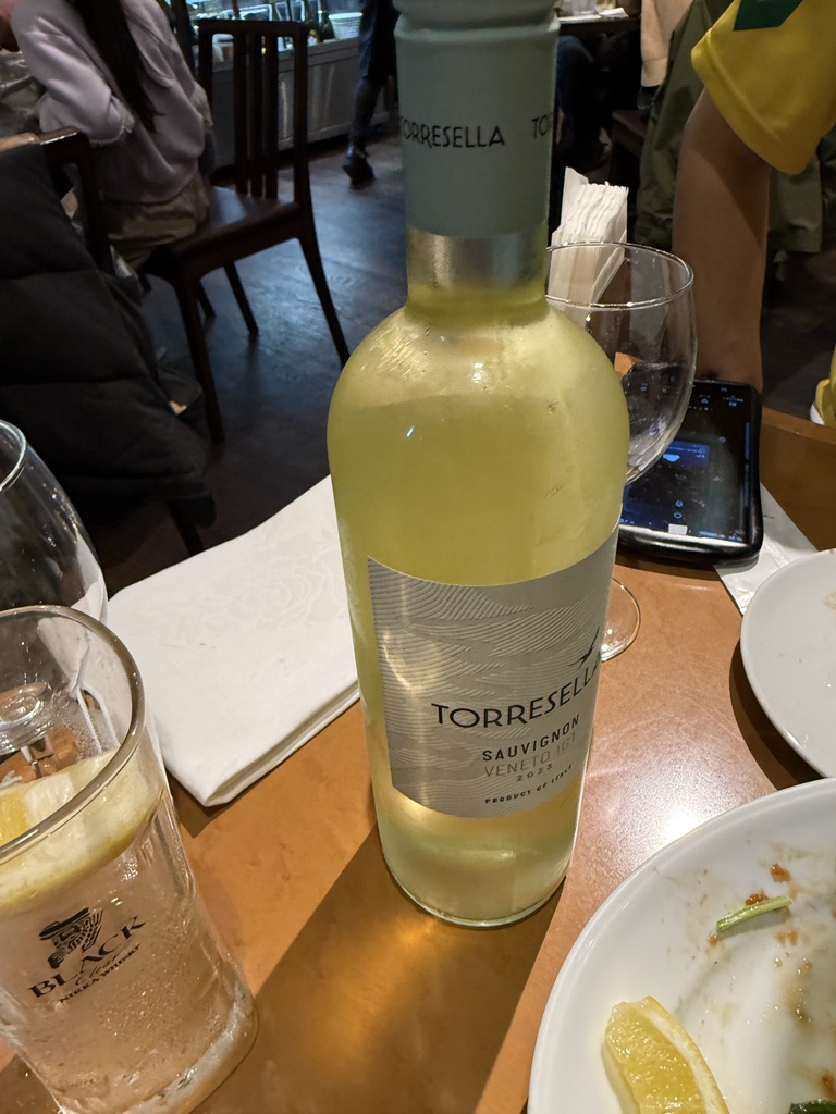 もうワイン行っちゃうかってことで、TorresellaのSauvignon Blanc、白をボトルで。料理に合わせやすくて飲みやすい。
