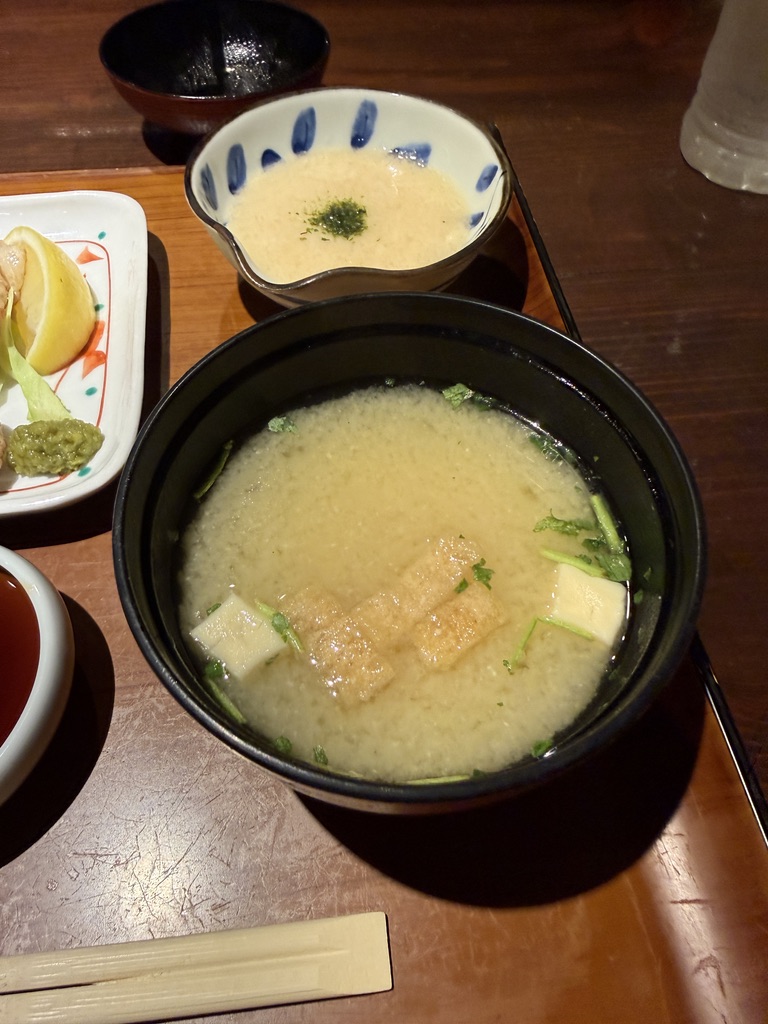 味噌汁は豆腐と油揚げ入りのしっかりした一杯。なんか油揚げがシャキッとしてた印象。
