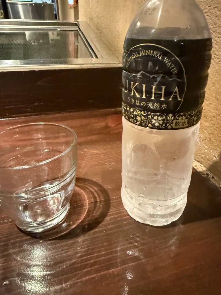 席に着くとうきはの天然水のペットボトルをはじめに渡されて、グラスに自分で注ぐスタイル。新宿店と一緒。なにげに余った分持って帰れるのは重宝します。