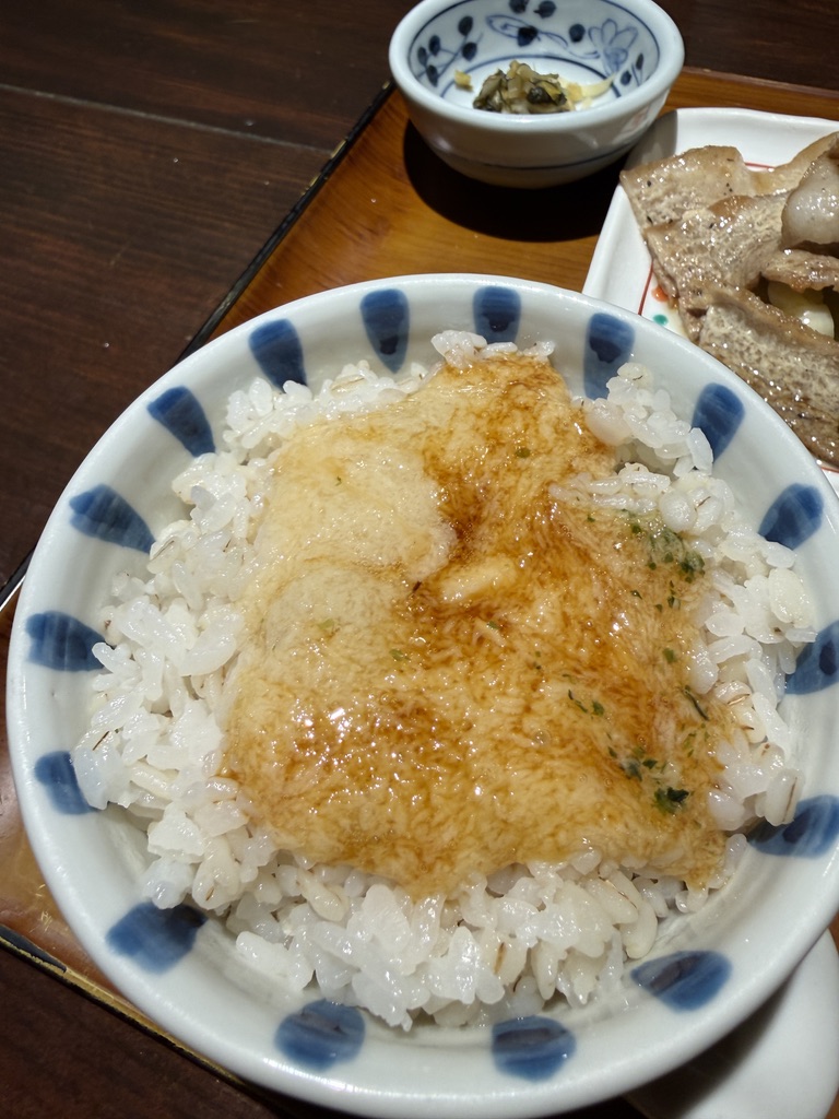 とろろは濃いめでねっとり。麦ごはんにかけると当然うまい。むぎごはん×とろろの安定コンビ。